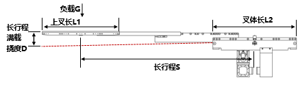 | 参考型号 | 叉体宽度 (mm) | 叉体厚度1 (mm) | 叉体厚度2 (mm) | 上叉长L1 (mm) | 叉体长L2 (mm) | 伸缩行程S 单/双(mm) | 负载G (kg) | 满载挠度D (mm,±10%) |